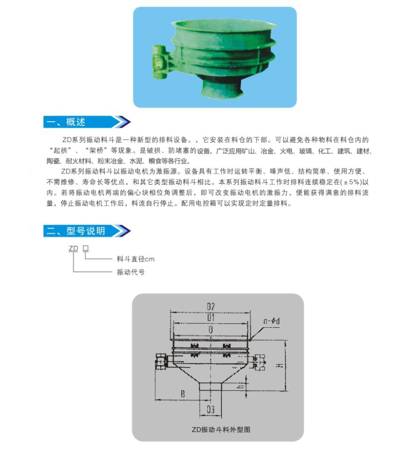 ZD系列振動料斗是一種新型的排料設(shè)備。,它安裝在料倉的下部??梢员苊飧鞣N物料在料倉內(nèi)的“起拱”、“架橋”等現(xiàn)象。是破拱、防堵塞的有效設(shè)備。廣泛應(yīng)用礦山、冶金、火電、玻璃、化工、建筑、建材、陶瓷、耐火材料、粉末冶金、水泥、糧食等各行業(yè)。
